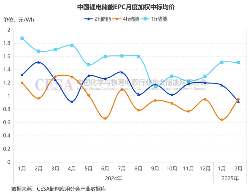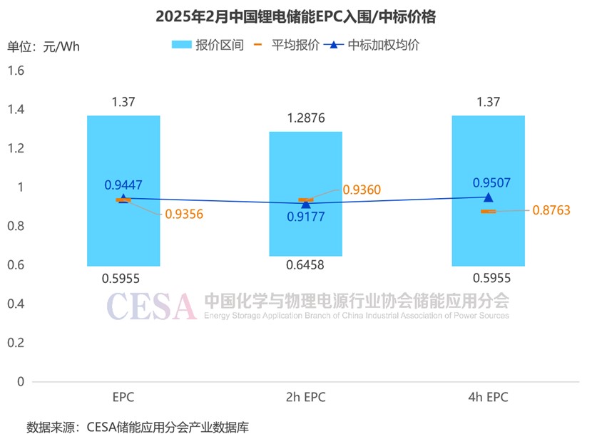 2025年2月,鋰電儲能EPC入圍投標(biāo)單價主要集中在0.5955-1.37元/Wh,平均報價0.9356元/Wh,中標(biāo)加權(quán)均價0.9447元/Wh,環(huán)比-13.53%。