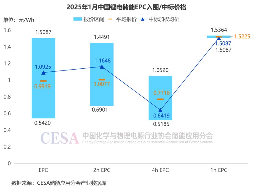 據(jù)CESA儲能應(yīng)用分會產(chǎn)業(yè)數(shù)據(jù)庫不完全統(tǒng)計(jì),2025年1月,鋰電儲能EPC入圍投標(biāo)單價主要集中在0.542-1.5087元/Wh,平均報價0.9919元/Wh,中標(biāo)加權(quán)均價1.0925元/Wh,環(huán)比-11.17%。