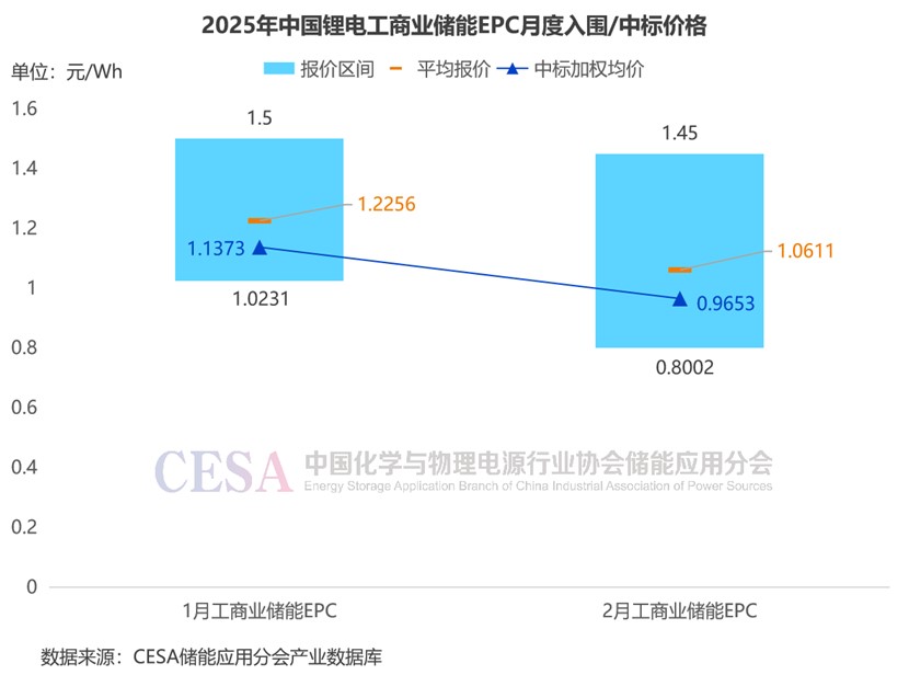 2025年2月,工商業(yè)儲能EPC入圍投標(biāo)單價在0.8002-1.45元/Wh范圍內(nèi),平均報價1.0611元/Wh,中標(biāo)加權(quán)均價0.9653元/Wh,環(huán)比-15.13%。最低報價來自于英德華潤燃?xì)庥邢薰竞狭继锼嘤邢薰緝δ茼?xiàng)目EPC工程總承包,該項(xiàng)目建設(shè)一套5MW/15MWh儲能單元,潤建股份有限公司以1200.36萬元的投保報價中標(biāo)了該項(xiàng)目,折合單價0.8002元/Wh。