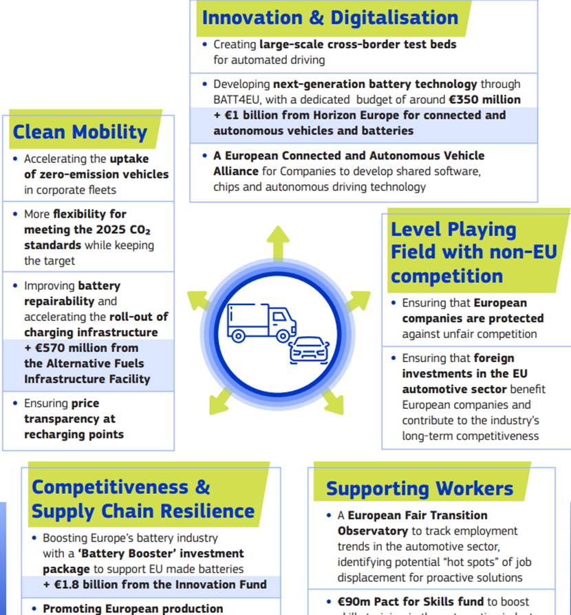 該行動(dòng)計(jì)劃將支持整個(gè)汽車行業(yè)向清潔、互聯(lián)和日益自動(dòng)化的汽車轉(zhuǎn)型,以確保其國(guó)際競(jìng)爭(zhēng)力。為實(shí)現(xiàn)這一目標(biāo),該計(jì)劃將解決五個(gè)關(guān)鍵優(yōu)先事項(xiàng):1)創(chuàng)新和數(shù)字化,2)轉(zhuǎn)向清潔出行,3)確保競(jìng)爭(zhēng)力和供應(yīng)鏈韌性,4)提高技能和解決社會(huì)問(wèn)題,5)保證公平的競(jìng)爭(zhēng)環(huán)境和有競(jìng)爭(zhēng)力的商業(yè)環(huán)境。