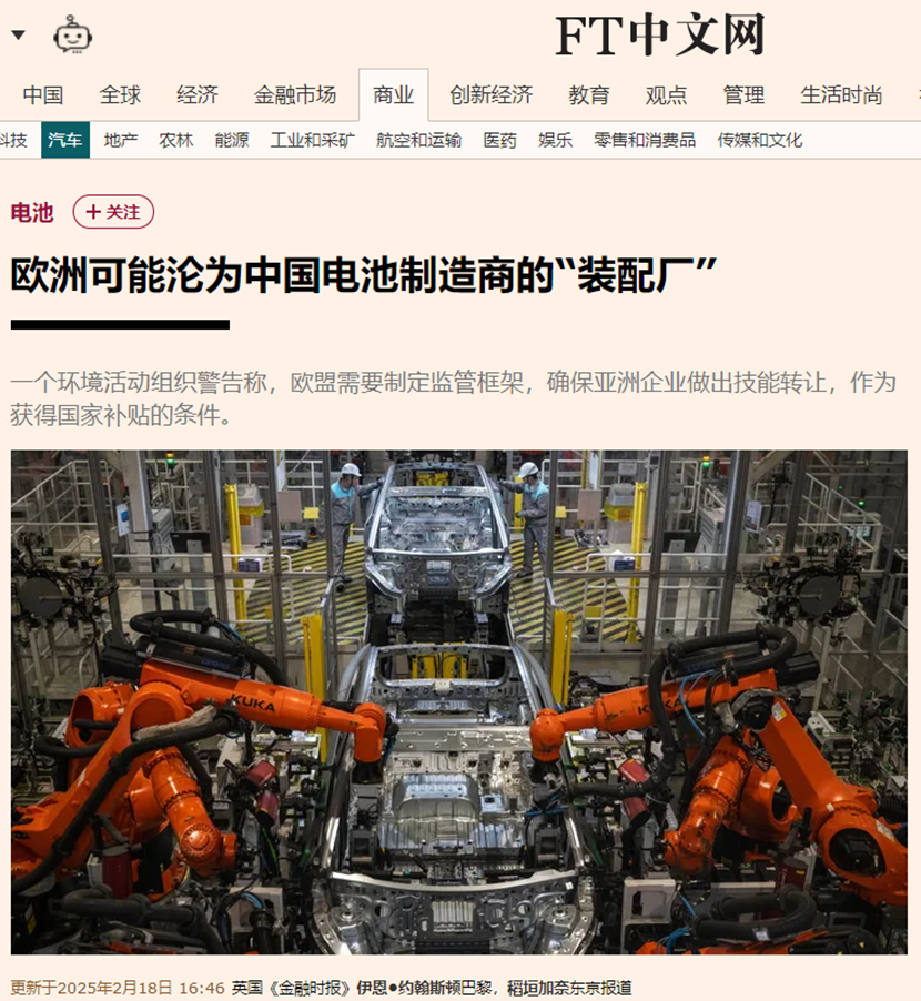 歐盟環(huán)境組織“運(yùn)輸與環(huán)境”(Transport & Environment)今年2月就發(fā)布報(bào)告稱,除非歐洲實(shí)行旨在確保以技術(shù)和技能轉(zhuǎn)讓換取國(guó)家援助的法規(guī),否則它可能成為中國(guó)電池制造商的“裝配廠”。