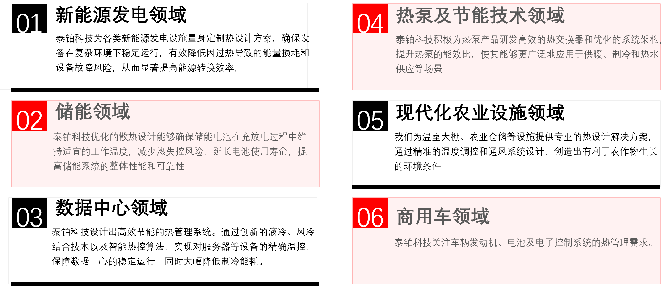 泰鉑科技業(yè)務(wù)領(lǐng)域主要涉及新能源發(fā)電、儲能、數(shù)據(jù)中心、熱泵及技能技術(shù)、現(xiàn)代化農(nóng)業(yè)設(shè)施及商用車領(lǐng)域范疇,致力于成為全球領(lǐng)先熱設(shè)計系統(tǒng)解決方案供應(yīng)商。