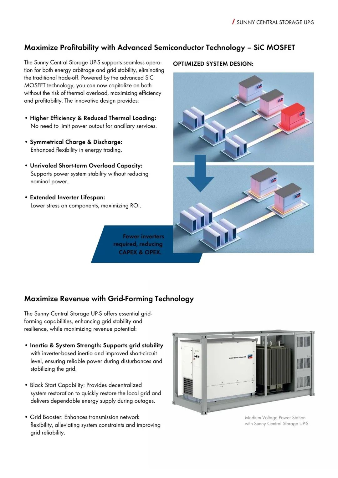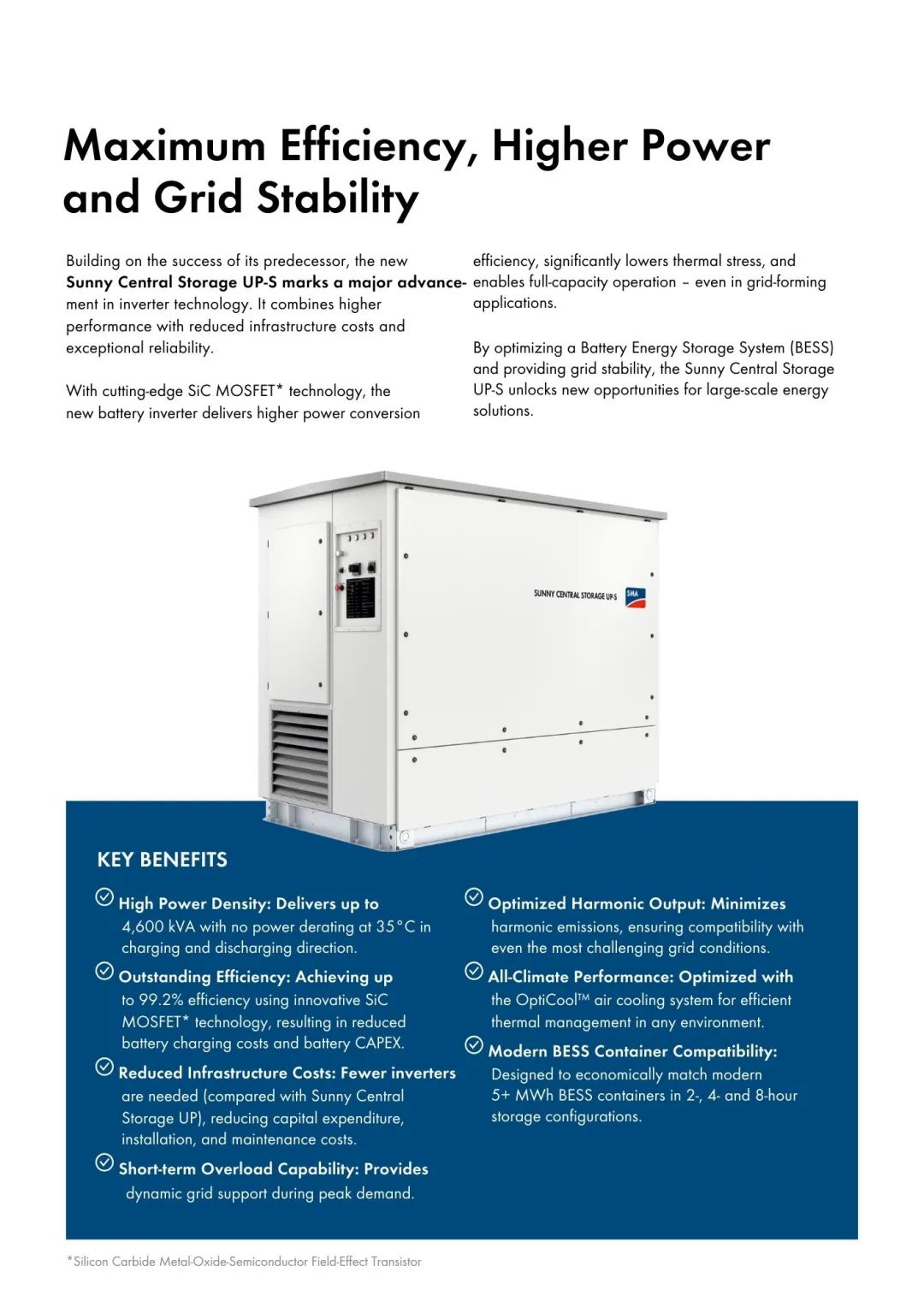 SiC MOSFET的應(yīng)用是此次Sunny Central Storage UP-S的核心優(yōu)勢(shì)所在。這一創(chuàng)新不僅能讓逆變器實(shí)現(xiàn)更高效的功率轉(zhuǎn)換,大幅降低熱負(fù)荷,并且在構(gòu)網(wǎng)過(guò)程中也能滿負(fù)荷運(yùn)行。這為開(kāi)發(fā)商和運(yùn)營(yíng)商帶來(lái)了更高的功率回報(bào)和更強(qiáng)的盈利能力,同時(shí)也降低了設(shè)施維護(hù)成本。