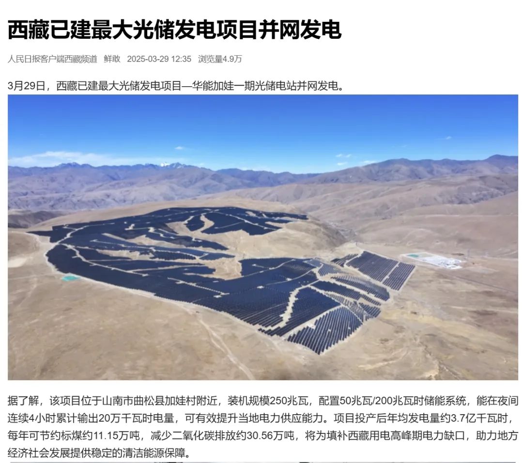 3月29日,西藏已建最大光儲(chǔ)發(fā)電項(xiàng)目——華能加娃一期光儲(chǔ)電站并網(wǎng)發(fā)電。
