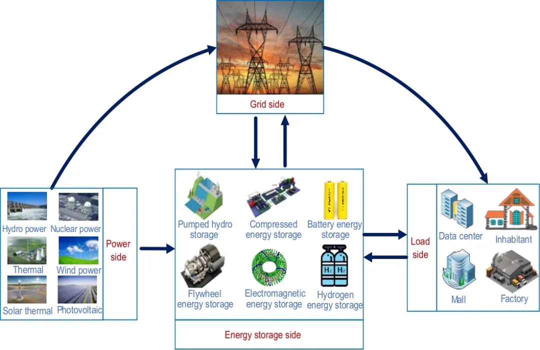 隨著雙碳目標(biāo)的穩(wěn)步推進(jìn),風(fēng)能、太陽能等可再生能源已成為電力新增裝機(jī)的主體。然而,可再生能源受自然條件的限制,具有間歇性、波動性等特點,致使現(xiàn)有電網(wǎng)難以消納大量可再生能源電力,造成棄風(fēng)棄光現(xiàn)象。為提高可再生能源消納水平,保持電網(wǎng)“源隨荷動”的平衡,儲能技術(shù)得到了大規(guī)模發(fā)展,可在發(fā)電側(cè)、電網(wǎng)側(cè)和用戶側(cè)進(jìn)行靈活的部署,如圖1所示。目前,儲能主要分為抽水蓄能、壓縮儲能、熱泵儲能、飛輪儲能、電化學(xué)儲能及電磁儲能等技術(shù)路線。就儲能規(guī)模、安全性及使用壽命而言,抽水蓄能和壓縮儲能更具優(yōu)勢。相比抽水蓄能,壓縮儲能布置更為靈活,依據(jù)儲能介質(zhì),可分為壓縮空氣儲能和壓縮CO2儲能。