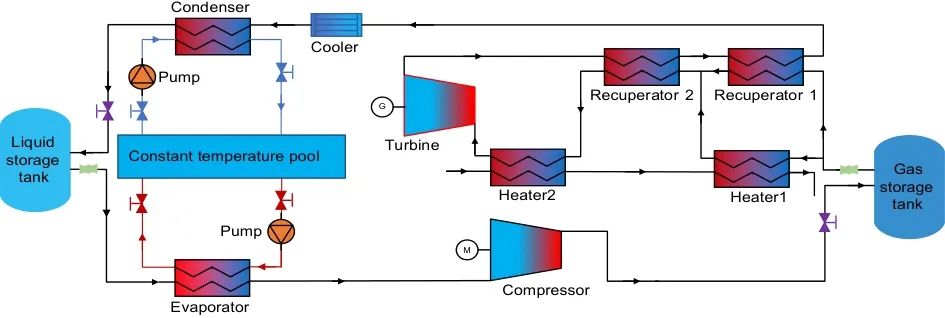 針對壓縮CO2混合工質(zhì)儲能系統(tǒng)的熱力性能,國內(nèi)研究者進(jìn)行了初步探索。青島科技大學(xué)將6種CO2混合工質(zhì)(CO2/R32、CO2/R1270、CO2/R290、CO2/R161、CO2/R600a、CO2/R600)應(yīng)用于兩級壓縮-兩級膨脹的儲能系統(tǒng),實現(xiàn)了高低壓罐液態(tài)存儲,并分析了系統(tǒng)的穩(wěn)態(tài)熱經(jīng)濟(jì)性。結(jié)果表明,在所考慮的CO2混合工質(zhì)中,CO2/R32(0.85/0.15,質(zhì)量分?jǐn)?shù))具有最高熱經(jīng)濟(jì)性,儲能效率及密度分別為60.12%、14.19 kWh/m3。此外,為提高電廠的運行靈活性,西安交通大學(xué)將兩級壓縮-一級膨脹的CO2混合工質(zhì)儲能與火力發(fā)電廠相結(jié)合,分析了5種CO2混合工質(zhì)(CO2/R290、CO2/R161、CO2/R32、CO2/R600、CO2/R600a)的系統(tǒng)穩(wěn)態(tài)性能。結(jié)果表明,相比于純工質(zhì)CO2,CO2混合工質(zhì)在較高環(huán)境溫度下可提高儲能系統(tǒng)的熱力性能。