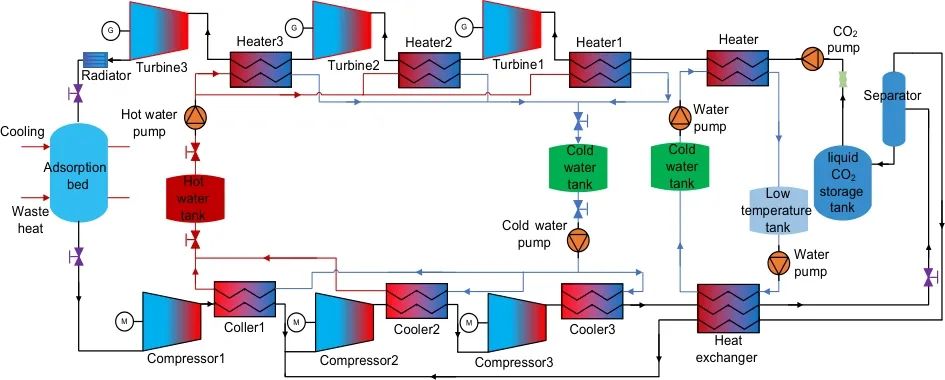 針對V-CO2/S-CO2儲能,華北電力大學(xué)郝銀萍基于地下含水層等壓儲氣庫建立了圖6所示的四級壓縮-四級膨脹V-CO2/S-CO2儲能系統(tǒng),并利用地?zé)崮芗訜岬谝患壨钙竭M(jìn)口前的高壓CO2,省略了壓縮機(jī)組的級后冷卻器和膨脹機(jī)組的級前加熱器。在此基礎(chǔ)上,作者開發(fā)了系統(tǒng)的穩(wěn)態(tài)熱力模型,并研究了各熱力參數(shù)對系統(tǒng)性能的影響規(guī)律,優(yōu)化設(shè)計工況下系統(tǒng)的儲能效率可達(dá)67.61%,儲能密度為2.259 kWh/m3。為提高低壓CO2儲能密度,哈爾濱工業(yè)大學(xué)高建民團(tuán)隊提出了圖7所示的三級壓縮-三級膨脹吸附式壓縮CO2儲能系統(tǒng),同時采用等溫高壓罐存儲S-CO2。研究表明,設(shè)計工況下基于吸附劑Fe-MOR及沸石吸附低壓CO2的儲能密度可分別達(dá)12.11 kWh/m3、6.29 kWh/m3。