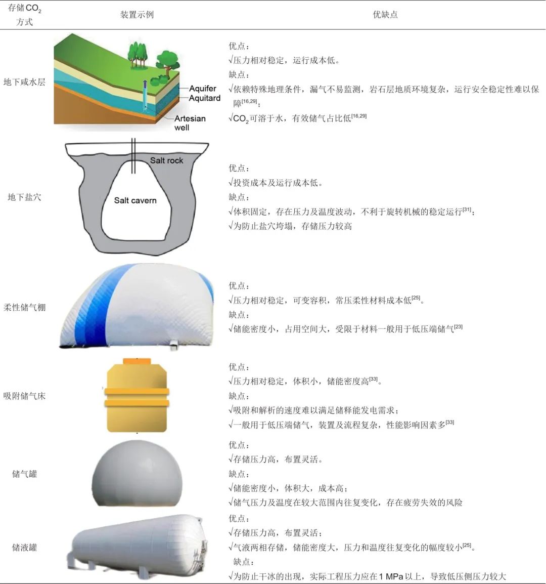 在壓縮CO2儲能系統(tǒng)中,高低壓CO2的存儲是實現(xiàn)CO2壓縮儲電與膨脹發(fā)電錯時運行的關(guān)鍵,直接決定著儲能效率及儲能密度。依據(jù)CO2存儲相態(tài)及方式,相關(guān)裝置主要分為地下咸水層、地下鹽穴、柔性儲氣棚、吸附儲氣床、儲氣罐及儲液罐,如表2所列。