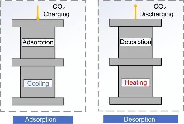 吸附儲氣床的原理是采用沸石等吸附劑在低溫下吸住CO2,在高溫下解吸CO2,從而實現(xiàn)CO2的存儲與釋放,如圖16所示。目前,吸附儲氣床可適用于儲能系統(tǒng)的低壓側(cè)儲氣,一般壓力范圍在0.1~0.2 MPa。此外,針對吸附儲氣,哈爾濱工業(yè)大學(xué)高建民教授團(tuán)隊實驗研究了沸石吸附低壓CO2的可行性。結(jié)果表明,在儲氣溫度25~57.6 ℃范圍內(nèi),CO2的儲氣密度可達(dá)43.46 kg/cm3。然而,吸附儲氣涉及吸附及解吸過程,同時需要配置冷熱源,流程復(fù)雜,且CO2儲放速率難以滿足大規(guī)模儲能下CO2質(zhì)量流量較高的要求。