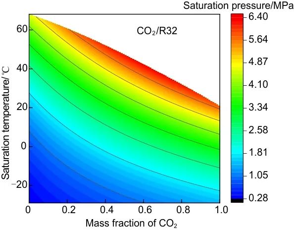 圖18 不同質(zhì)量分?jǐn)?shù)下CO2混合工質(zhì)的飽和溫度-壓力特性
