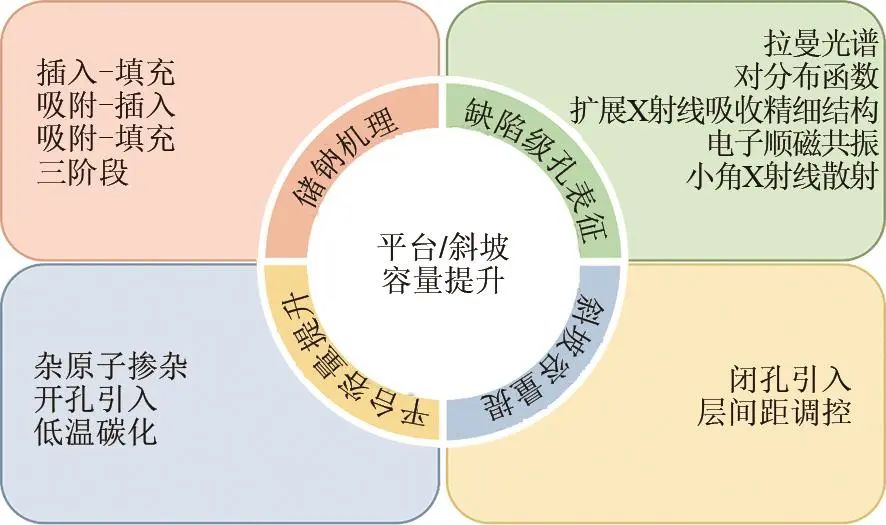硬碳容量可以分為0.1 V以上的斜坡容量和0.1 V以下的平臺容量(圖1)。斜坡容量具有高的動力學(xué)響應(yīng)速度,提升斜坡區(qū)容量可以改善倍率性能及循環(huán)性能。斜坡容量提升策略主要通過調(diào)控硬碳的缺陷或結(jié)構(gòu)特征,來增加鈉離子的吸附和擴大鈉離子的擴散路徑。平臺區(qū)具有較低的放電電壓,這直接影響鈉離子電池的能量密度和功率密度。平臺容量提升策略則側(cè)重于對孔的改性,以增強硬碳的儲鈉位點。對于不同的硬碳材料,其斜坡/平臺容量提升策略不盡相同且目前尚無綜述對斜坡/平臺區(qū)提升策略進行系統(tǒng)綜述,因此有必要進行深入探討與討論。本文首先綜述了硬碳在鈉離子電池中的儲鈉機理,其次綜述了缺陷以及孔結(jié)構(gòu)的表征方法,并詳細(xì)探討不同策略在提升硬碳容量方面的最新進展和應(yīng)用前景。希望通過這些討論,為未來的研究提供有價值的參考。