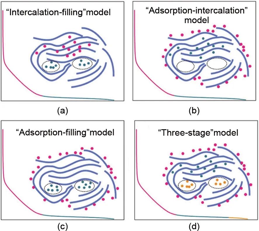 硬碳的儲鈉機理是一個復(fù)雜且多方面的過程,其不確定性限制了對其微觀結(jié)構(gòu)的合理設(shè)計和電化學(xué)性能的優(yōu)化。因此,深入研究硬碳材料的儲鈉機理對于開發(fā)高性能的硬碳材料至關(guān)重要。目前,關(guān)于硬碳儲鈉機理的研究提出了多種模型,主要包括三種機制:電容吸附、納米孔填充和碳層間插入。首先,電容吸附機制主要歸因于碳材料的內(nèi)在缺陷和異質(zhì)原子。增強電容吸附有利于提高倍率和長循環(huán)性能。其次,平臺區(qū)的儲鈉機制仍然沒有定論。關(guān)于平臺區(qū)的爭議主要來自于層間距和封閉孔尺寸的相似性,使得識別困難。基于這幾種機制,提出了包括“插入-填充”機制,“吸附-插入”機制,“吸附-填充”機制和“多段過程”機制,如圖2所示。
