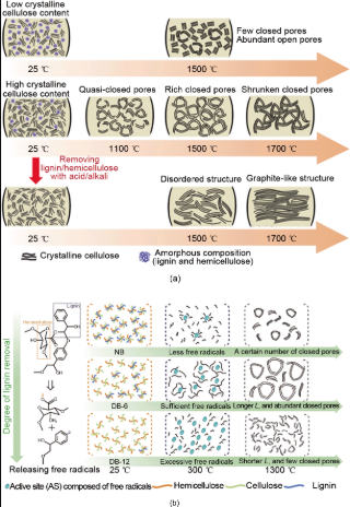 深入了解閉孔的形成機理有利于構(gòu)建高容量硬碳負(fù)極的合理設(shè)計。Tang等通過碳化三種不同結(jié)晶度的生物質(zhì)前驅(qū)體發(fā)現(xiàn),復(fù)合生物質(zhì)中高結(jié)晶度的纖維素可以轉(zhuǎn)化為長的類石墨層,這種類石墨層傾向于形成封閉孔結(jié)構(gòu)。復(fù)合生物質(zhì)中的無定形組分(例如木質(zhì)素、半纖維素)有助于防止高溫碳化過程的過度石墨化。但其在研究過程中并未關(guān)注低溫碳化時碳結(jié)構(gòu)的演變。因此,Wang等通過釋放前驅(qū)體中的自由基的手段補充了低溫?zé)峤舛伍]孔的形成機理。天然竹材經(jīng)過適當(dāng)?shù)拿撃舅靥幚砗?,其自由基暴露出來,增強了碳化反?yīng)活性。充足的自由基促進了前驅(qū)體碎片在碳化反應(yīng)中的利用,從而得到了發(fā)達(dá)的碳層,形成了豐富的閉孔。但是,當(dāng)木質(zhì)素幾乎完全被去除時,大量自由基形成的活性位點競爭利用體相中有限的前體碎片形成短的碳層。小的微晶尺寸使硬碳更容易堆積和致密化,導(dǎo)致開孔以及閉孔的減少以及真密度的增加,如圖4所示。