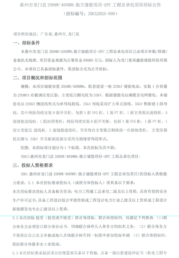 中國儲能網(wǎng)訊:4月1日,龍門索英鑫能儲能科技有限公司發(fā)布廣東惠州200MW/400MWh獨立儲能EPC招標公告,項目資金為自籌資金68000萬元,約合1.7元/Wh。