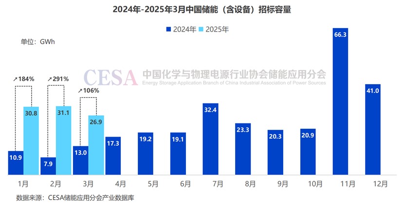 2025年3月,CESA儲(chǔ)能應(yīng)用分會(huì)產(chǎn)業(yè)數(shù)據(jù)庫(kù)共追蹤到162個(gè)新型儲(chǔ)能招標(biāo)項(xiàng)目,其中儲(chǔ)能EPC/PC(含直流側(cè)設(shè)備)、儲(chǔ)能系統(tǒng)采購(gòu)招標(biāo)總規(guī)模達(dá)8.1GW/26.9GWh,容量較之去年同期增長(zhǎng)106%。其中,儲(chǔ)能EPC/PC招標(biāo)規(guī)模5.67GW/15.98GWh,儲(chǔ)能系統(tǒng)采購(gòu)招標(biāo)2.42GW/10.89GWh。