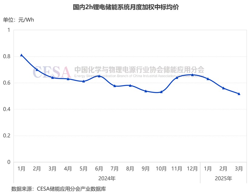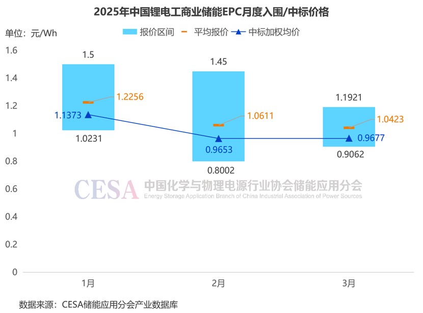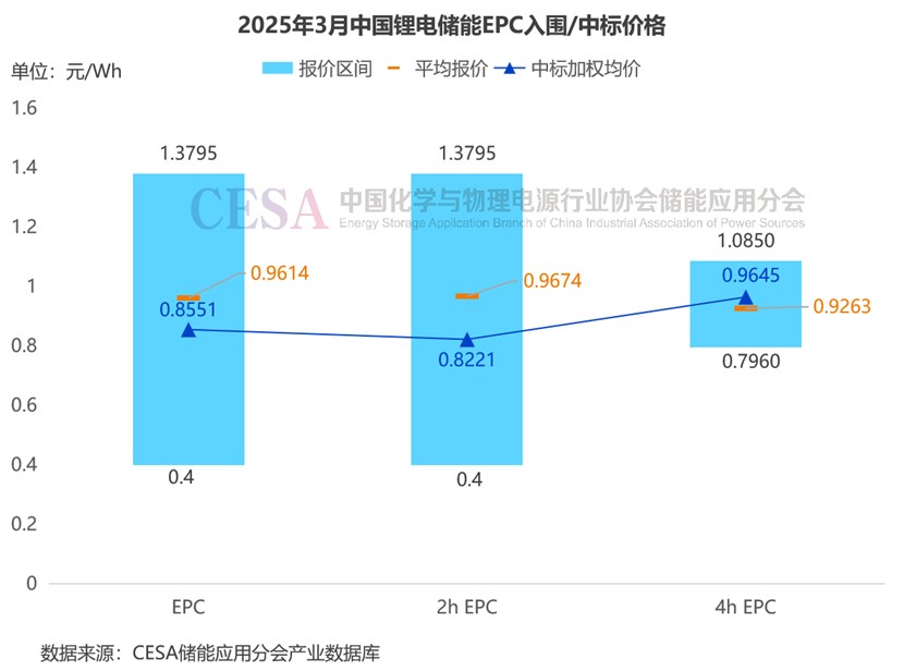據(jù)CESA儲(chǔ)能應(yīng)用分會(huì)產(chǎn)業(yè)數(shù)據(jù)庫(kù)不完全統(tǒng)計(jì),2025年3月,鋰電儲(chǔ)能EPC/PC入圍投標(biāo)單價(jià)主要集中在0.4-1.3795元/Wh,平均報(bào)價(jià)0.9614元/Wh,中標(biāo)加權(quán)均價(jià)0.8551元/Wh,環(huán)比-9.49%。