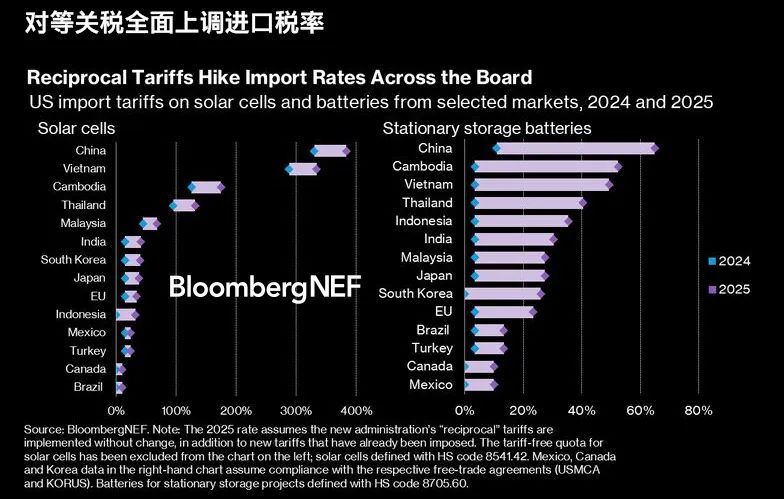 對各國的進口關(guān)稅差異很大,許多國家面臨的稅率高于全面適用的10%。10%的稅率從4月5日起實施,針對具體國家的關(guān)稅將于4月9日生效。受沖擊最大的是亞太地區(qū):根據(jù)這項新政策,對柬埔寨、越南和中國進口產(chǎn)品的關(guān)稅稅率將分別飆升至49%、46%和34%。自中國進口的一系列清潔能源已經(jīng)面臨高關(guān)稅;這些關(guān)稅還會進一步提高。