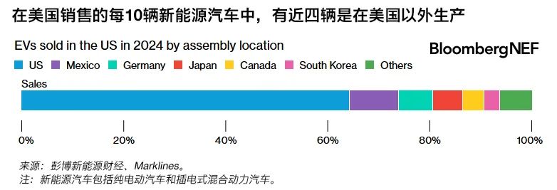 根據(jù)彭博新能源財經(jīng)估計,2024年在美國銷售的150萬輛新能源汽車中,約36%在國外組裝——這意味著它們將立即受到新的汽車關(guān)稅的影響。去年,在這些非美國組裝的新能源汽車中,約21.7萬輛(即13.7%)在墨西哥和加拿大生產(chǎn)。德國和日本制造的新能源汽車分別占美國新能源汽車總銷量的6.8%和5.9%。