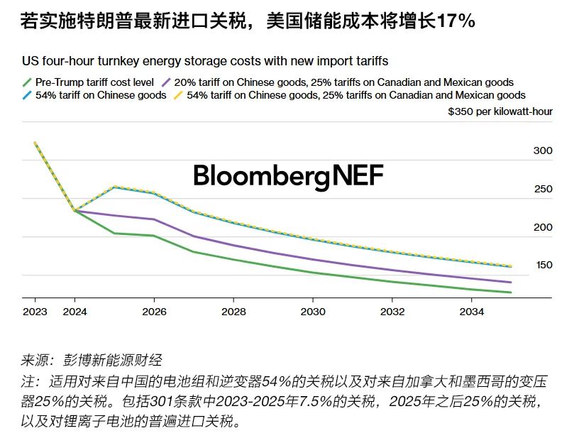 結(jié)果是儲能系統(tǒng)成本將給不斷增長的美國儲能市場踩剎車。如果對來自中國的商品加征34%的關(guān)稅,2025年美國四小時交鑰匙系統(tǒng)的成本將增加17%。一個四小時交鑰匙系統(tǒng)目前的成本為266美元/kWh,較特朗普不實施進口關(guān)稅的情景高出30%。由于成本高于預期,項目開發(fā)商和承購商可能需要考慮推遲和取消早期項目。