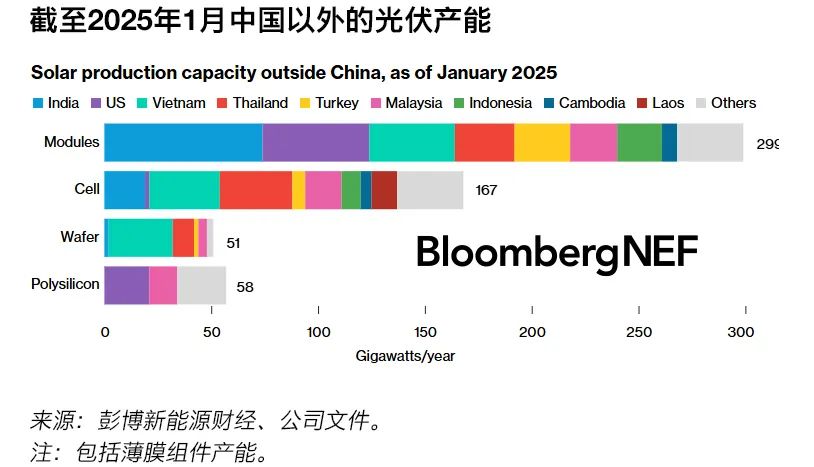 印度最近填補了越南和泰國等高關(guān)稅國家的一些光伏供應商留下的空白。但在最近的關(guān)稅變化中,印度將蒙受損失,因為印度光伏產(chǎn)品出口面臨的關(guān)稅總和高達41%(14%來自201條款關(guān)稅,27%來自最新報復性關(guān)稅)。東南亞國家面臨的關(guān)稅仍高于印度,但最近的關(guān)稅上調(diào)已大大縮小了差距。