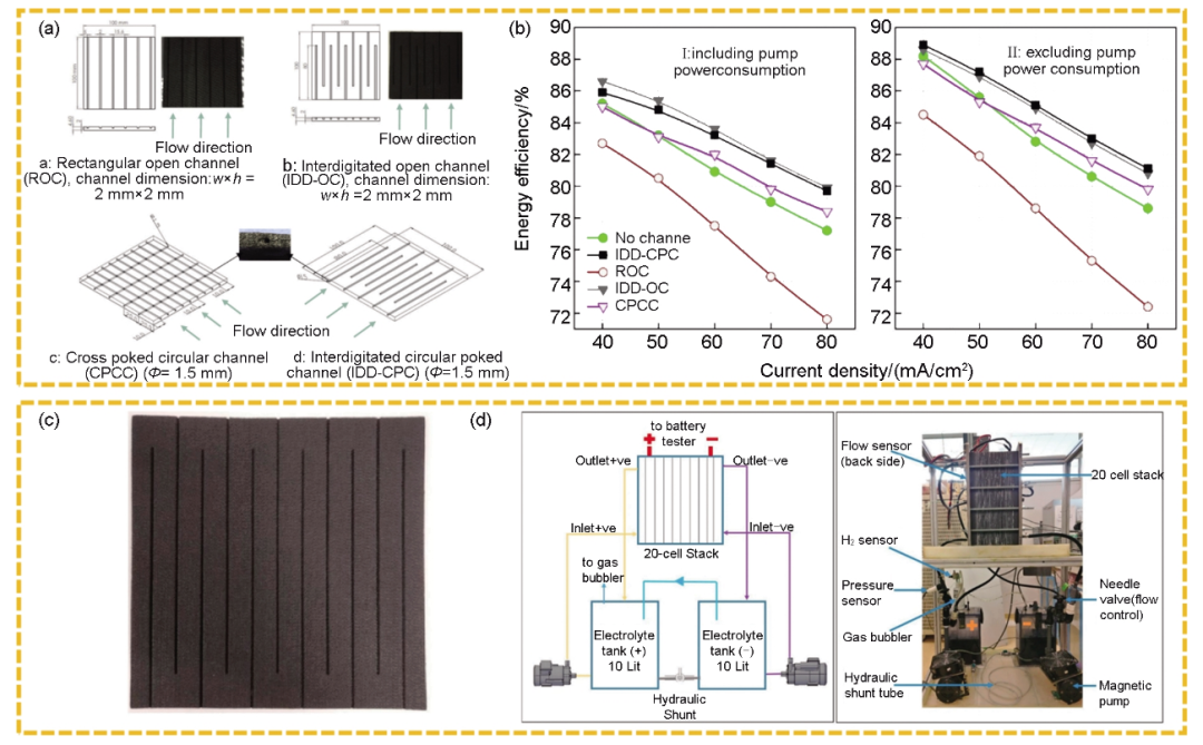 圖2 (a) 加工在電極表面的流道;(b) 不同電流密度下的能量效率;(c) 1 kW電堆堆疊的方形電極(25 cm×25 cm);(d) 用于測試20節(jié)電池組的實驗裝置