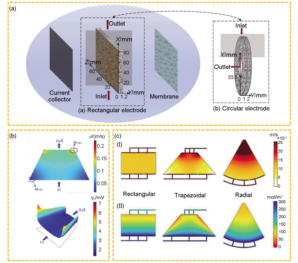 傳統(tǒng)的矩形電極在電池大電流充放電條件下,通常存在電解液出口附近質(zhì)量傳輸較弱的問題,限制了電池在高電流密度下運行。Zhang團隊創(chuàng)新性地提出了一種圓形釩電池設(shè)計(circular flow battery,CFB)[圖3(a)],旨在通過減小電解液從入口到出口的橫截面積,以降低電解液傳輸過程中的濃差極化和泵送消耗。Zhang團隊研究發(fā)現(xiàn),圓形電極的離子濃度梯度隨著圓周的橫截面積從外向內(nèi)逐漸減小,不過對其速度或濃度分布還很難評估。為解決電解液入口和出口傳質(zhì)最弱帶來的濃差極化問題,Yue等又進一步提出梯形電極(trapezoid flow battery,TFB)設(shè)計。與矩形電極相比,梯形電極具有更小的濃差極化和更均勻的電解液分布[圖3(b)],電池在低流速、高電流密度和低泵耗的情況下,能量效率高達85.64%,優(yōu)于圓形電極的性能(83.31%)。Gurieff等通過三維模擬評估了電極的幾何結(jié)構(gòu)變化對電解液速度和濃度分布的影響[圖3(c)],與矩形電極結(jié)構(gòu)相比,徑向扇形結(jié)構(gòu)在電解液傳質(zhì)過程中表現(xiàn)出更高的電解液流動速度,且具有良好的活性離子濃度梯度特征,但同時帶來的高壓降問題仍然是一個挑戰(zhàn)。