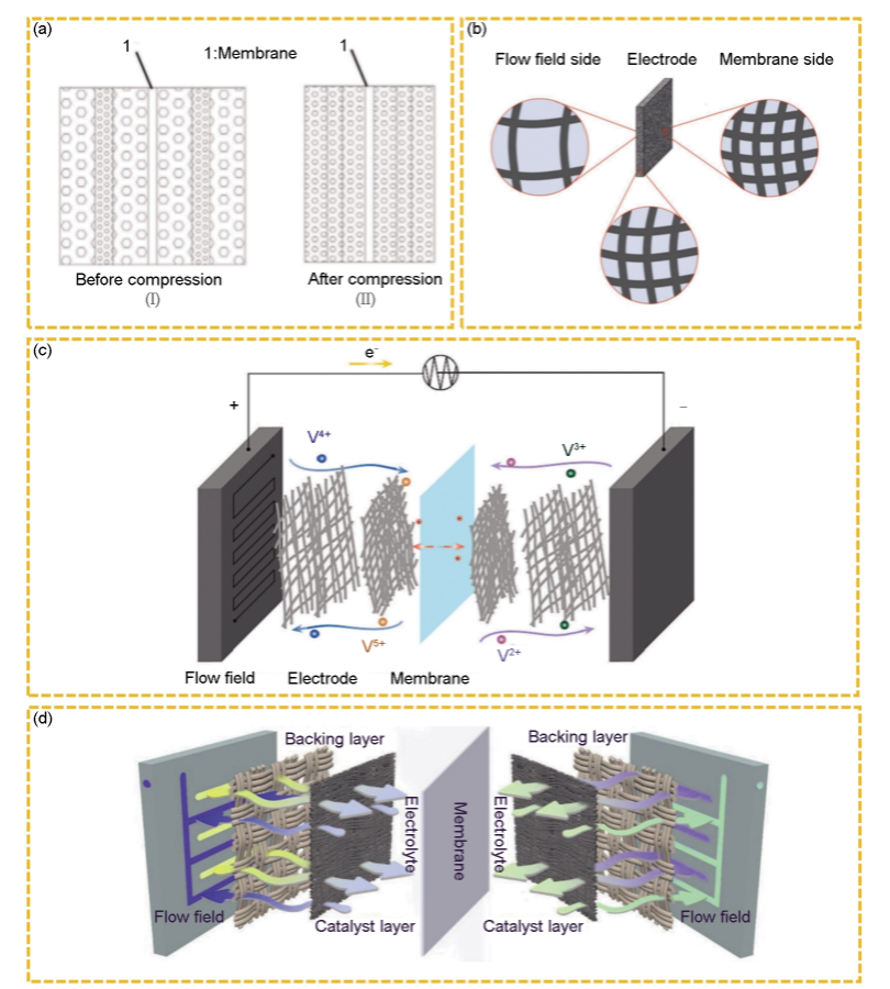 圖5 (a) 多層電極結(jié)構(gòu)壓縮前后對比;(b) VRFB的梯度電極設(shè)計;(c) 具有不同電極層孔隙率的電池結(jié)構(gòu);(d) 雙層電極結(jié)構(gòu)液流池