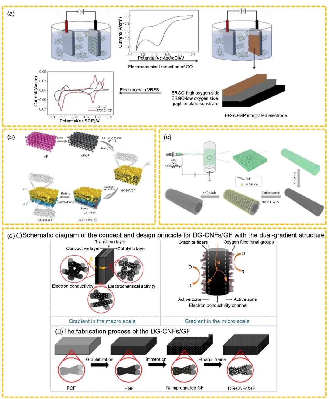 圖6 (a) 新型復合電極(ERGO-GP)的制備示意圖及循環(huán)伏安圖;(b) 雙功能梯度GO-rGO/GF電極材料的制造過程;(c) CNF-AECF電極的合成過程;(d) DG-CNFs/GF電極及合成過程