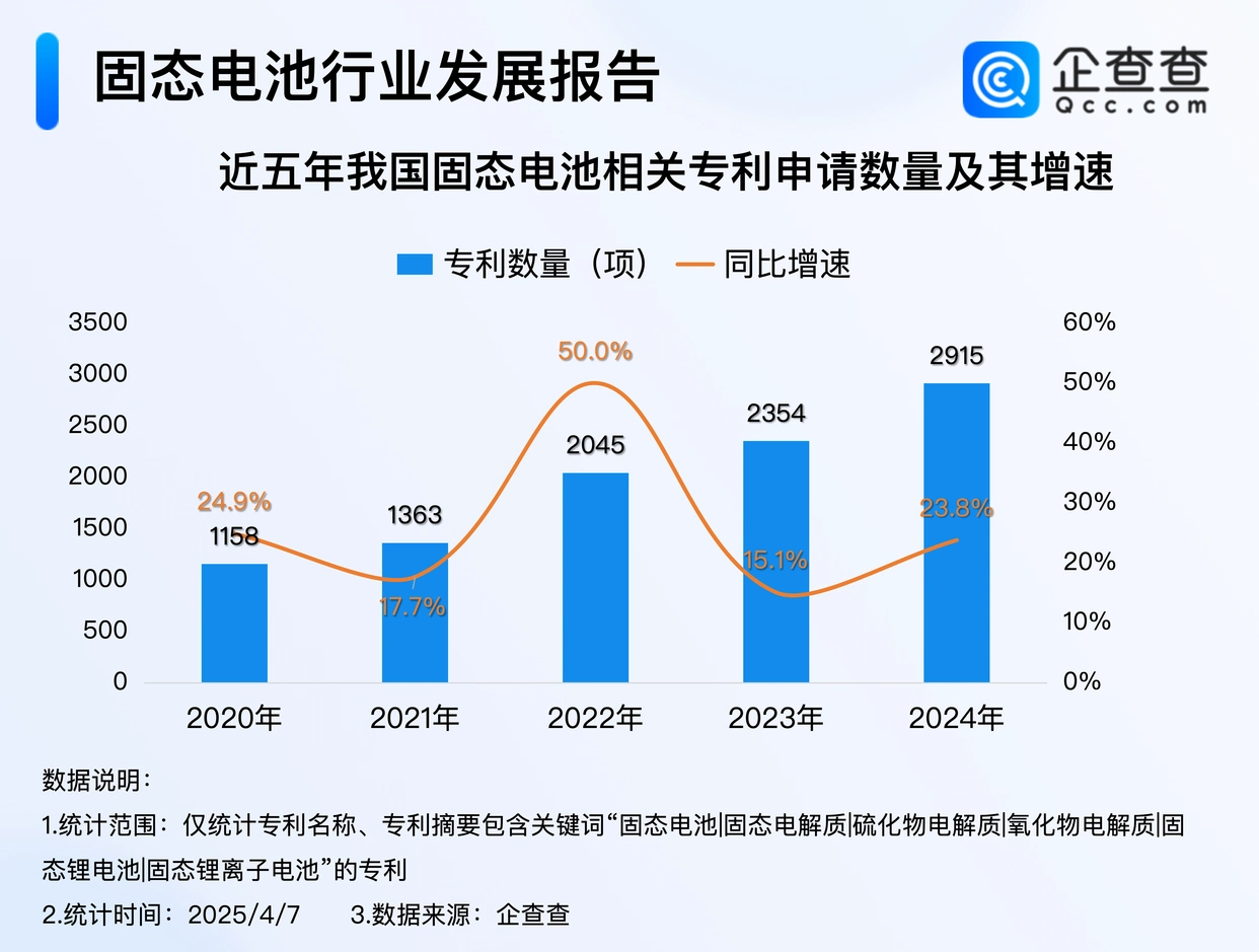 企查查數(shù)據(jù)顯示,2020年以來,我國固態(tài)電池相關(guān)專利申請量逐年增加,2022年申請量同比增加50.0%至2045項,達近五年申請量增速峰值。2024年,我國累計申請2915項固態(tài)電池相關(guān)專利,創(chuàng)近五年申請量新高。