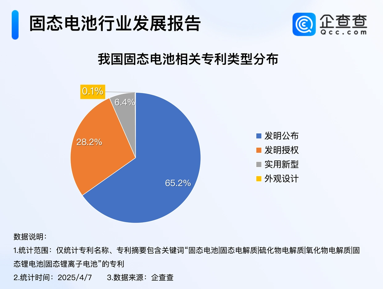 企查查數(shù)據(jù)顯示,截至4月7日,我國固態(tài)電池相關(guān)專利申請量達1.3萬項,類型上以發(fā)明專利為主,占比超九成,其中發(fā)明公布占比65.2%,發(fā)明授權(quán)占比28.2%;外觀設計類占比最少,為0.1%。