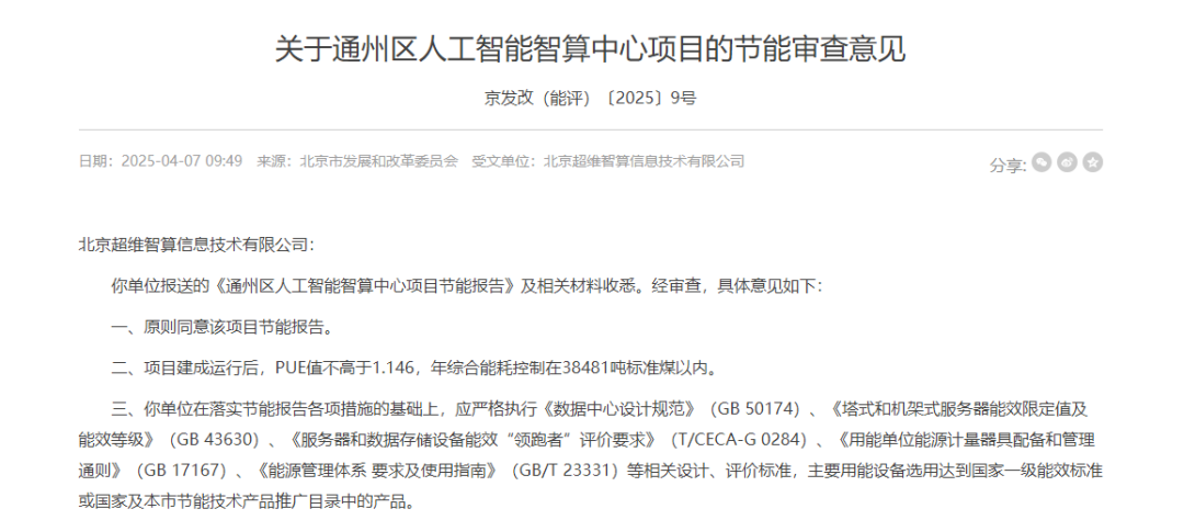 根據(jù)節(jié)能審查意見,該項(xiàng)目的報(bào)送單位為北京超維智算信息技術(shù)有限公司,原則同意該項(xiàng)目節(jié)能報(bào)告。