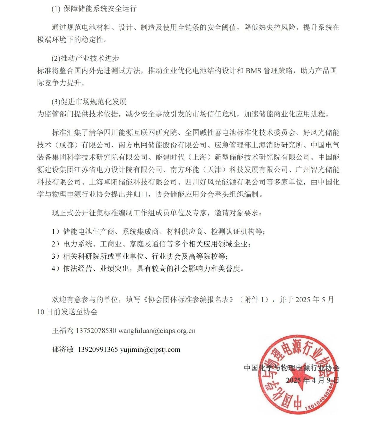 中國化學(xué)與物理電源行業(yè)協(xié)會關(guān)于《半開放儲能鋰離子電池本征安全要求》團(tuán)體標(biāo)準(zhǔn)立項(xiàng)的通知