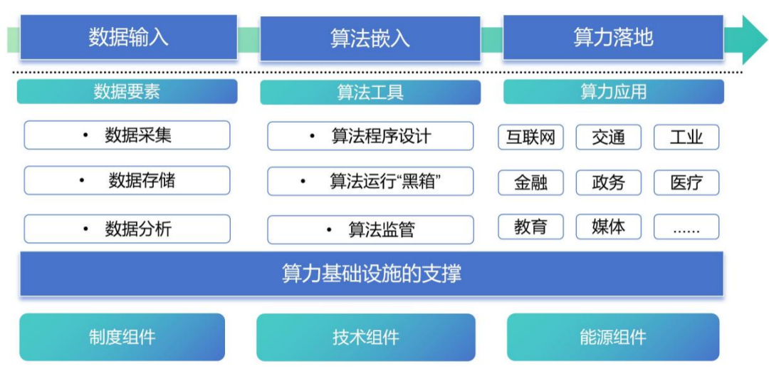 在保障環(huán)節(jié),算力的生成和落地離不開基礎(chǔ)設(shè)施的保障和支撐。從算力基礎(chǔ)設(shè)施的基本樣態(tài)出發(fā),可劃分為制度組件、技術(shù)組件和能源組件。