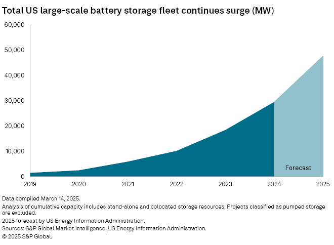 受套利和基本電網(wǎng)服務(wù)收入的推動(dòng),尤其是在加州 ISO 和德克薩斯州電力可靠性委員會(huì)市場(chǎng),美國(guó)電池儲(chǔ)能系統(tǒng)在 2020 年至 2024 年間增長(zhǎng)了十倍以上,超過(guò)了抽水蓄能。去年,電池儲(chǔ)能系統(tǒng)也首次超過(guò)了天然氣年度新增容量。