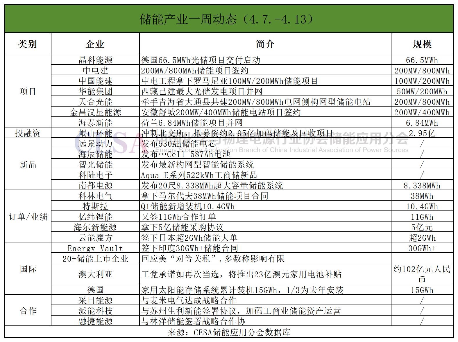 國際方面,近日,包括陽光電源、億緯鋰能、欣旺達、華寶新能、首航新能等20+ A股儲能上市公司回應美“對等關稅”政策影響,多數(shù)企業(yè)表示影響有限;瑞士重力儲能廠商Energy Vault簽下印度30GWh+儲能合同;德國家用太陽能存儲系統(tǒng)累計裝機15GWh,1/3為去年安裝;澳大利亞工黨承諾如再次當選,將推出23億澳元家用電池補貼;配儲2200MWh,Copia Power大型光儲項目獲17.1億美元融資。