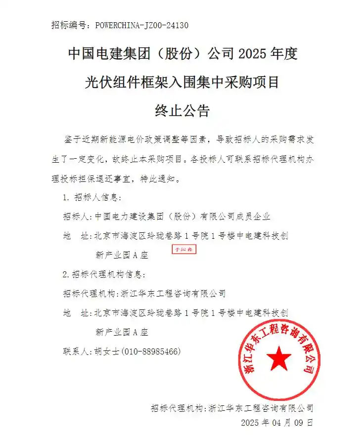 4月9日,中國電建設備物資集中采購平臺公布的關于“中國電建集團(股份)公司2025年度光伏組件框架入圍集中采購項目終止公告”顯示,鑒于近期新能源電價政策調整等因素,導致招標人[即中國電力建設集團(股份)有限公司成員企業(yè)]的采購需求發(fā)生了一定變化,故終止本采購項目。落款為招標代理機構浙江華東工程咨詢有限公司。