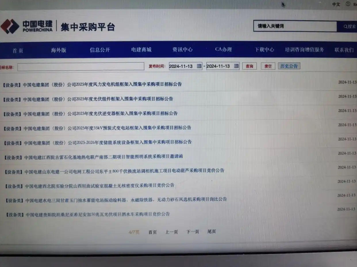 圖為中國電建設備物資集中采購平臺發(fā)布的2025年度光伏組件框架入圍集中采購項目招標公告,以及風電機組、光伏逆變器、儲能系統和變電站相關采購招標公告。