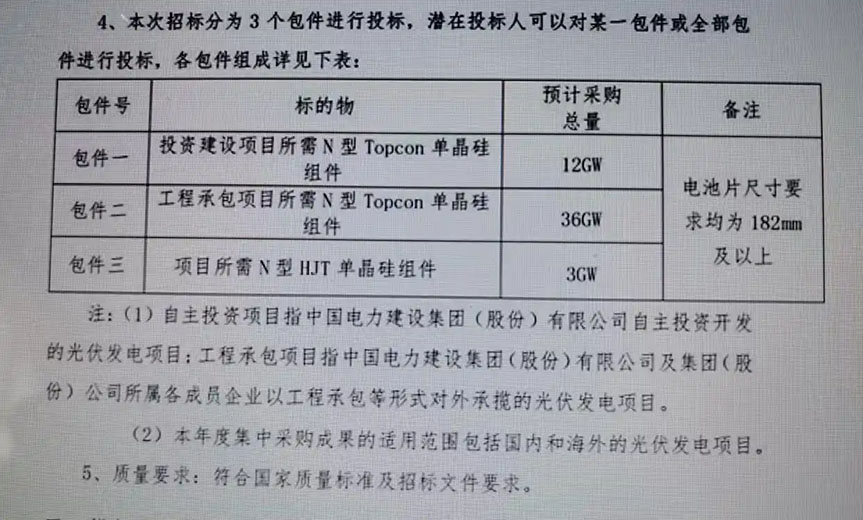 圖為中國電建設備物資集中采購平臺發(fā)布的2025年度光伏組件框架入圍集中采購項目招標部分內容。