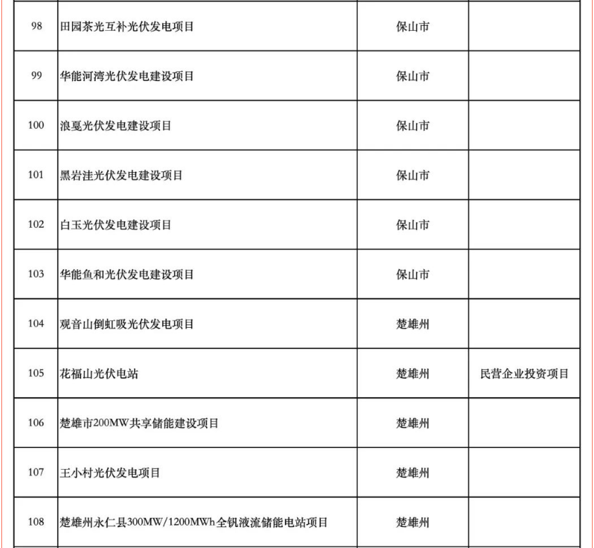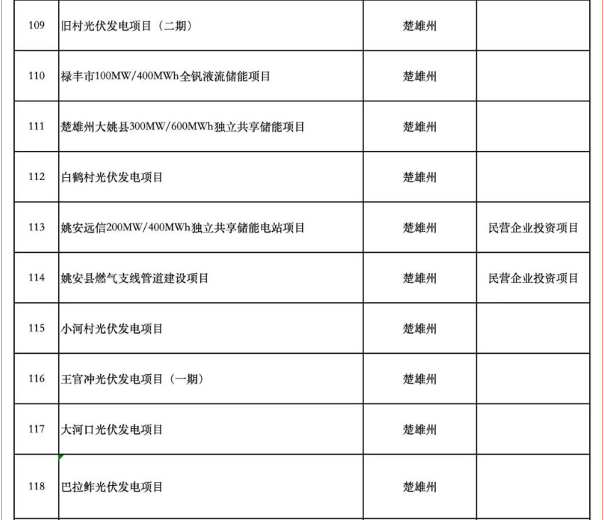 重大項(xiàng)目清單中含17個(gè)儲(chǔ)能項(xiàng)目。同時(shí),楚雄州永仁縣300MW/1200MWh全釩液流儲(chǔ)能電站項(xiàng)目列為“重中之重”項(xiàng)目清單。