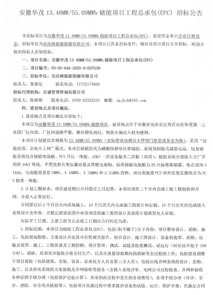 中國儲能網(wǎng)訊:4月14日,安徽華茂13.48MW/55.09MWh儲能項目工程總承包(EPC)項目招標(biāo)公告發(fā)布,項目招標(biāo)人為安慶峽能新能源有限公司,項目位于安徽省安慶市宜秀區(qū)安慶華茂第二工業(yè)園廠區(qū)內(nèi)部。