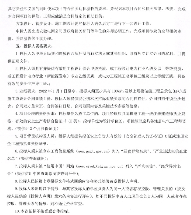 要求2022年1月1日至今,投標(biāo)人須至少具有100MWh及以上規(guī)模儲能工程總承包(EPC)或施工或設(shè)計合同業(yè)績1份。
