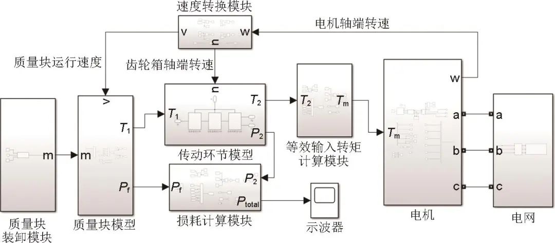 依據(jù)上文各環(huán)節(jié)損耗數(shù)學表達式及相應的能效計算方法,建立基于MATLAB/Simulink的TCS-GESS能效分析模型。首先,能效分析包括質量塊模型和傳動環(huán)節(jié)模型,與損耗計算模塊結合,可實現(xiàn)各環(huán)節(jié)損耗占比分析。其次,通過等效輸入轉矩計算模塊得到實際工況下的負載轉矩,將其輸入至電機模塊,實現(xiàn)重力儲能系統(tǒng)的工況模擬。最后,速度轉換模塊將電機軸端的角速度轉化成電機軸轉速與質量塊運行速度,反饋于各環(huán)節(jié)模型,實現(xiàn)動態(tài)閉環(huán)響應,如圖4所示,其中T1為質量塊等效轉矩,T2為經(jīng)傳動環(huán)節(jié)后輸入至齒輪箱的轉矩,Tm為電機軸端轉矩,P2為經(jīng)傳動機構后的損耗功率,Ptotal為系統(tǒng)功率損耗的總和。