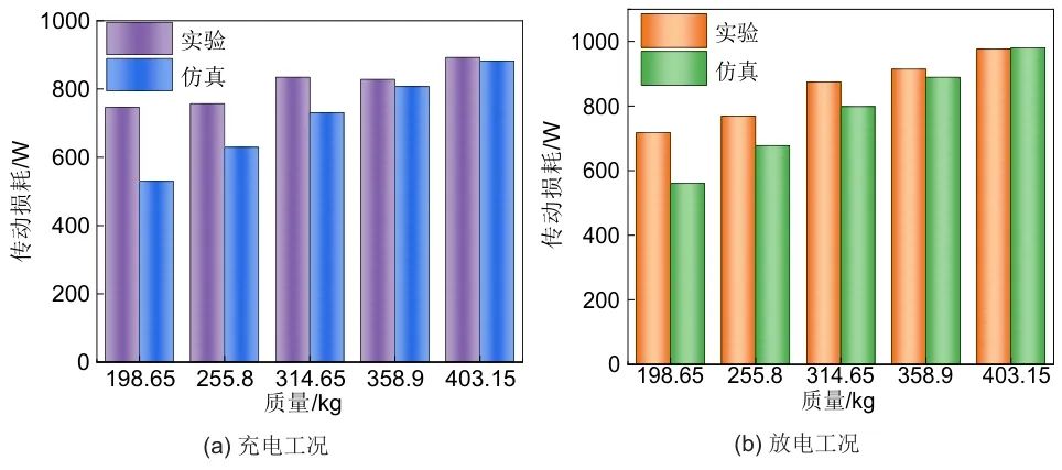 結果表明,輕載時受實驗環(huán)境及質量塊無法正常出力影響,系統(tǒng)樣機阻力較大,不可控損耗以電機損失電功率的形式承擔,工況波動造成傳動損耗較仿真有所增加,故導致實驗與仿真存在差異;在額定負載工況下,不可損耗占比變小且工況逐漸穩(wěn)定,從上述五個維度仿真結果與實測能效數(shù)據(jù)基本一致,且變化規(guī)律與前述理論吻合,驗證了能效分析模型的準確性與實用性。