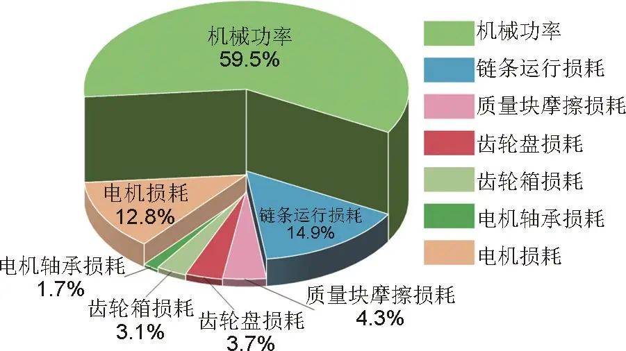 在不同負載條件下,基于能效分析模型展開進一步分析,得放電工況下各損耗模塊占比情況,見表2,其中圖14為額定工況下各損耗百分比占比。結果表明,在整個系統(tǒng)損耗中鏈條運行損耗占比較大,且隨著逐漸加載的過程中,損耗增幅較大。與轉速直接相關的齒輪箱和齒輪盤損耗變化不大且占比較小。電機損耗占比中等,隨動力增加而增加,變化規(guī)律與前述理論分析吻合。隨著質量塊不斷加載,系統(tǒng)放電效率逐漸提高,額定工況下可達37.4%。