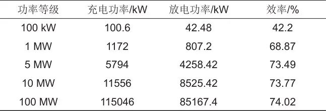 利用本模型對具有相同傳動機構、不同功率等級下的重力儲能系統(tǒng)充放電效率進行預測,分別以100 kW、1 MW、5 MW、10 MW、100 MW為例。充放電功率均對應同等質量下的質量塊進行仿真,結果見表3??梢钥闯?,效率隨著重力儲能系統(tǒng)功率等級的提升而增加,但是當功率等級進一步提升時,系統(tǒng)效率增益較弱,故通過仿真結果得到的變化規(guī)律與前述理論分析吻合。