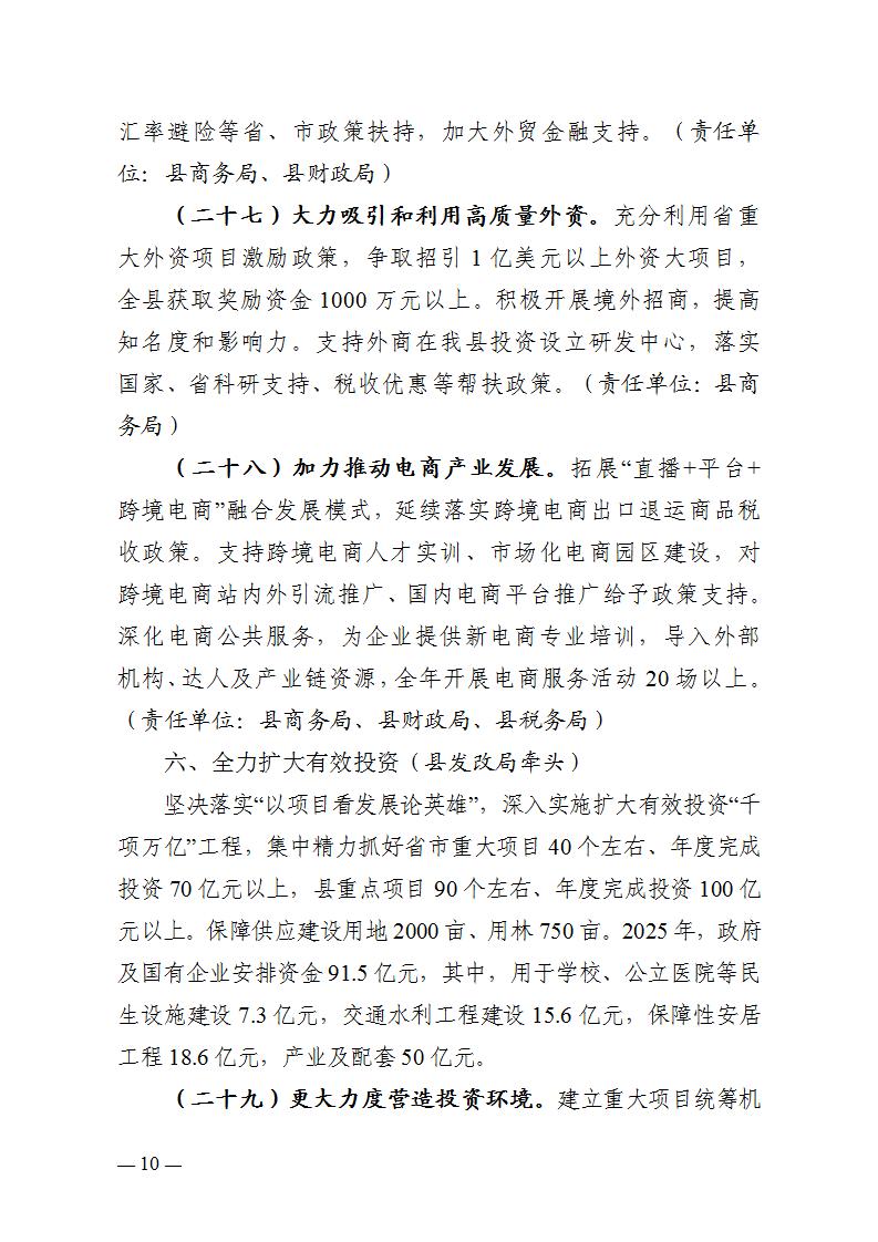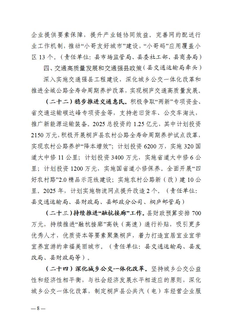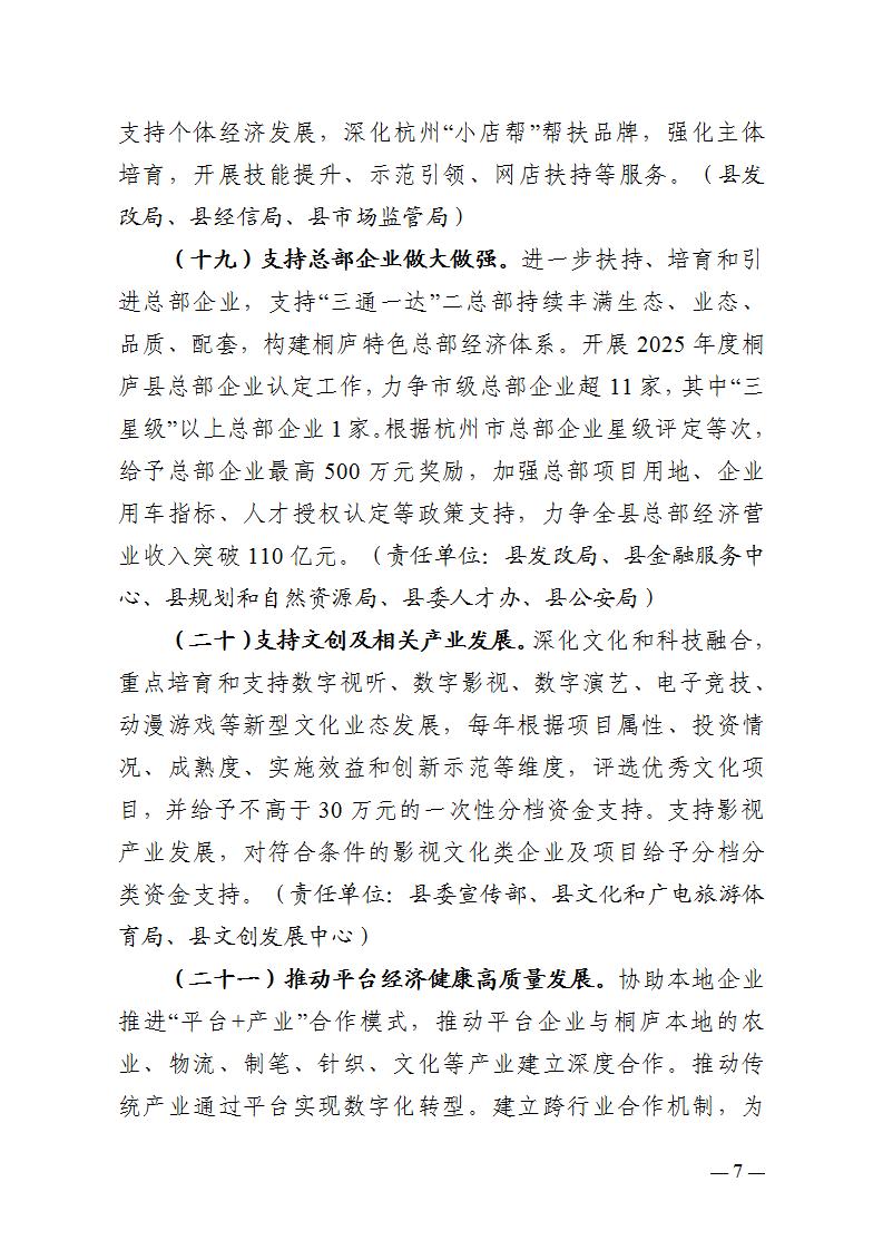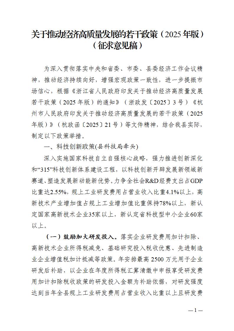為深入貫徹落實中央和省委、市委、縣委經(jīng)濟工作會議精神,推動經(jīng)濟持續(xù)向好,增強宏觀政策一致性,進一步提振市場信心,根據(jù)《浙江省人民政府印發(fā)關(guān)于推動經(jīng)濟高質(zhì)量發(fā)展若干政策(2025年版)的通知》(浙政發(fā)〔2025〕3號)《杭州市人民政府印發(fā)關(guān)于推動經(jīng)濟高質(zhì)量發(fā)展的若干政策(2025年版)》(杭政函〔2025〕21號)等文件精神,結(jié)合我縣實際,我縣擬定了《關(guān)于推動經(jīng)濟高質(zhì)量發(fā)展的若干政策(2025年版)(征求意見稿)》,現(xiàn)向社會公開征求意見。(征求意見地址:http://minyi.zjzwfw.gov.cn/dczjnewls/dczj/idea/topic_21512.html)