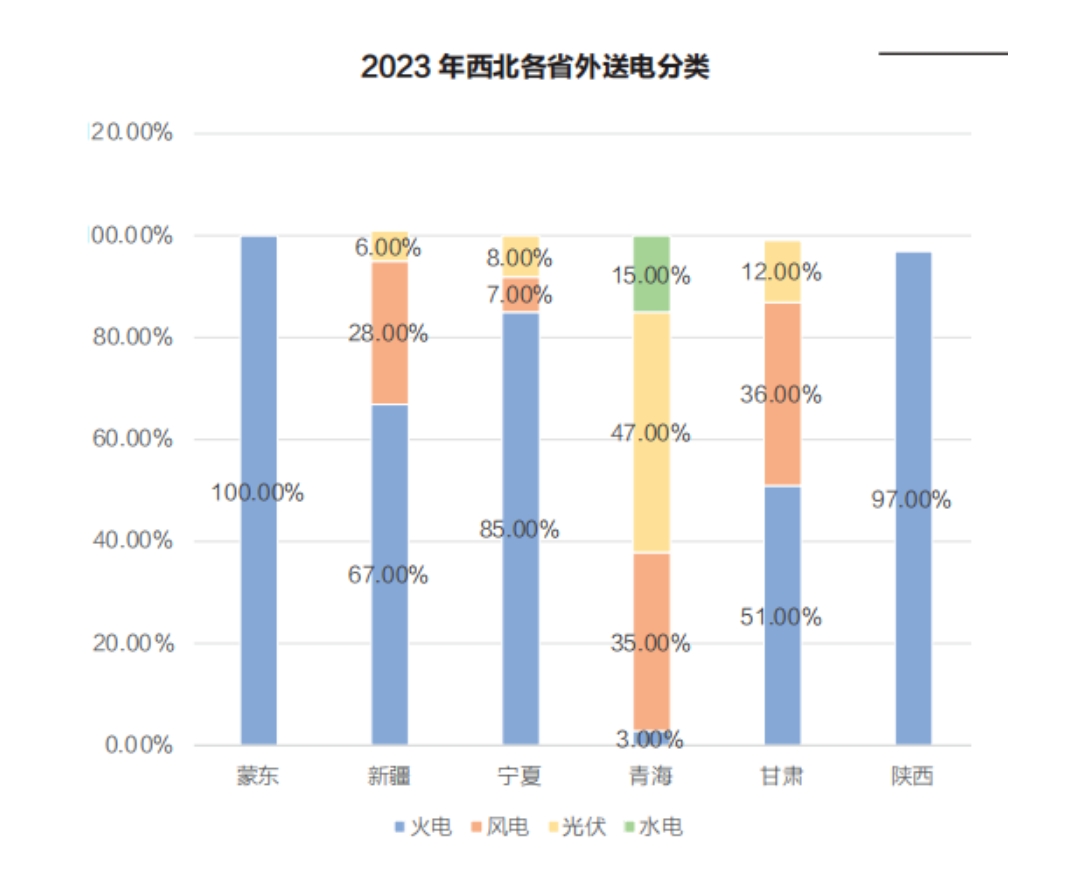 圖表所示不難看出,各個(gè)電力輸出大省,以火電外送為主。這也從側(cè)面證明了另一個(gè)特高壓外送新能源的問(wèn)題:在特高壓線路上,外送的新能源占比太低。