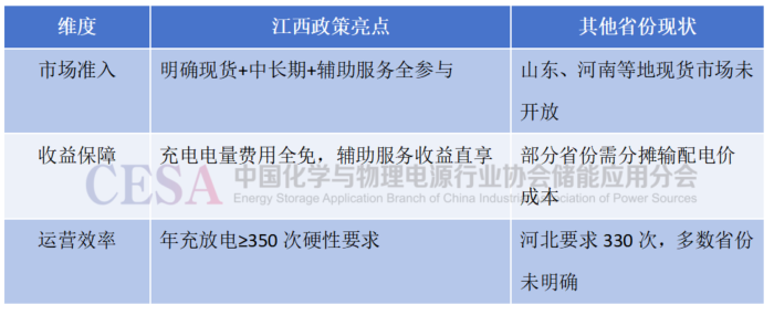 對(duì)比全國(guó)各省儲(chǔ)能政策,江西新政在市場(chǎng)化深度、收益保障和運(yùn)營(yíng)效率三方面表現(xiàn)尤為亮眼,具體見下表: