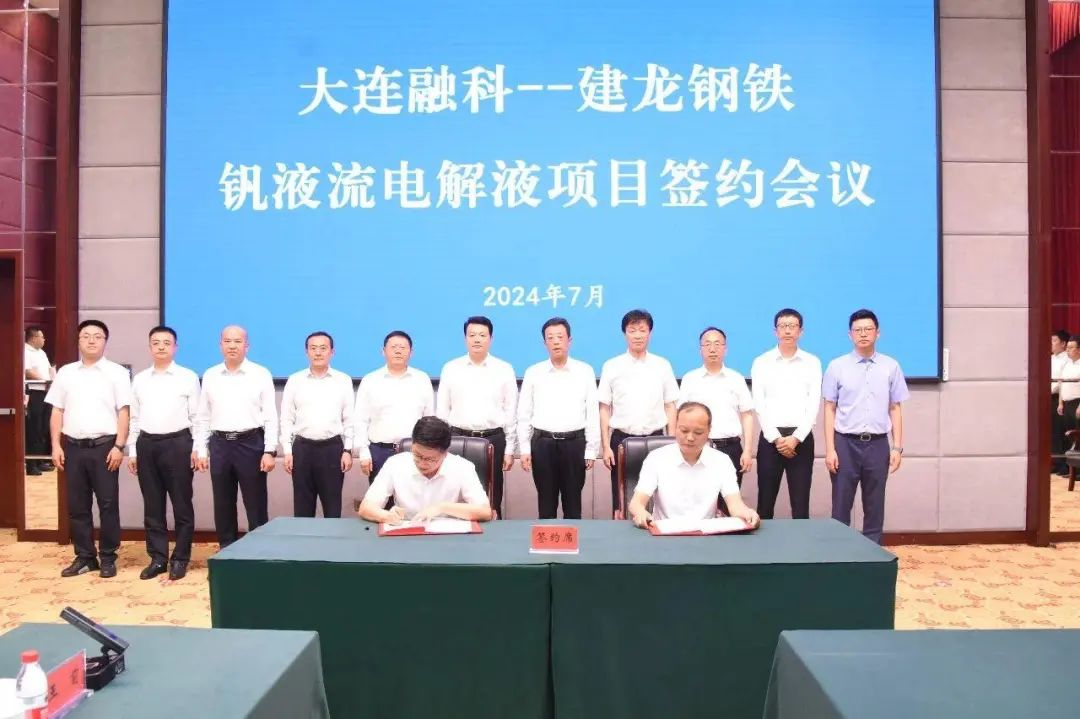 2024年7月13日,大連融科儲能集團股份有限公司和黑龍江建龍鋼鐵有限公司在雙鴨山市迎賓館舉行釩液流電解液項目簽約會議。會上經過兩家公司友好協(xié)商,最終達成一致,共同出資設立黑龍江融祥儲能科技有限公司,助力雙鴨山“全釩液流電池電解液”產業(yè)發(fā)展,并簽訂了釩液流電解液項目合作協(xié)議。