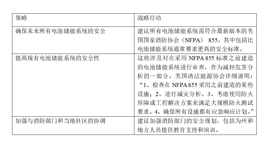 《電池儲能:安全藍(lán)圖》的是一個包含政策提案和戰(zhàn)略建議策略,旨在提高電池儲能系統(tǒng)的安全性。下表詳細(xì)介紹了該策略的各個部分。